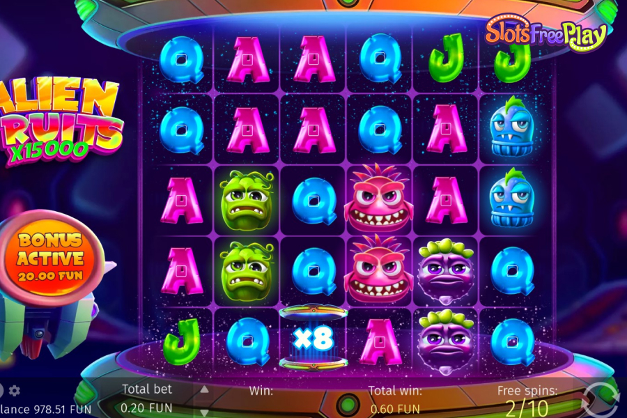 FreeSpins is a popular and exciting bonus feature in the Alien Fruits slot that rewards players with a set number of spins without deducting any money from their balance. To activate the FreeSpins feature in Alien Fruits, players typically need to land a certain number of Scatter symbols on the reels.Once triggered, the game will grant the player a predetermined number of free spins.