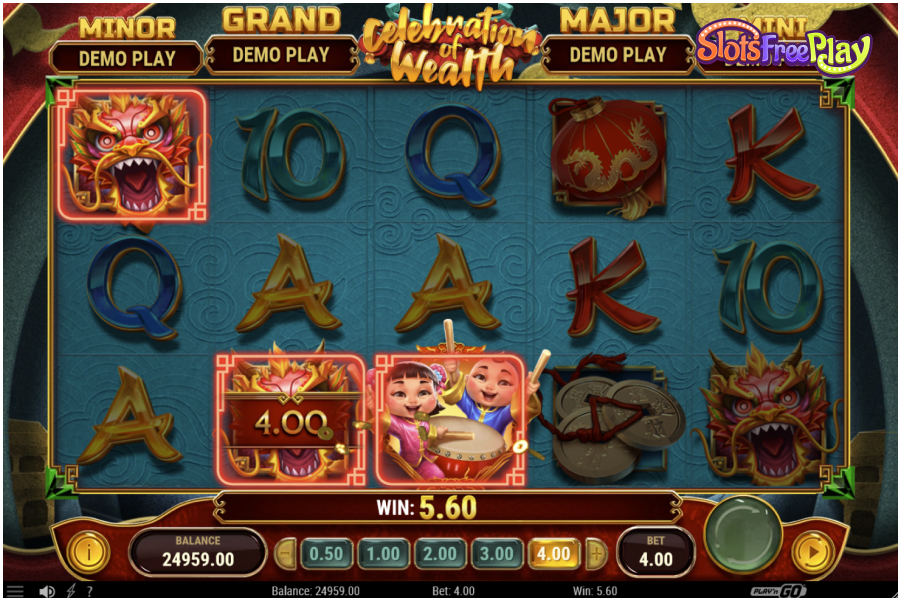 Celebration of Wealth not only captivates players with its visually stunning theme of Oriental opulence, featuring vibrant colors and intricate details reminiscent of Chinese culture, but also immerses them in a captivating auditory experience. The slot's soundtrack complements its theme with melodic tunes inspired by traditional Asian music, creating an ambiance that enhances the overall gaming atmosphere. The sound effects, from the cheerful chimes of winning spins to the dramatic tones accompanying special features, further contribute to the excitement. The gameplay of Celebration of Wealth is seamlessly woven into its thematic elements. The reels are adorned with symbols representing iconic elements of Chinese culture, including dragons, lanterns, and firecrackers. The Children symbol, acting as the Wild, brings the Fu Babies to life and adds a playful touch to the gameplay. The incorporation of the Palace symbol as the Scatter not only aligns with the Chinese theme but also introduces engaging bonus opportunities, transporting players into the heart of a festive celebration.