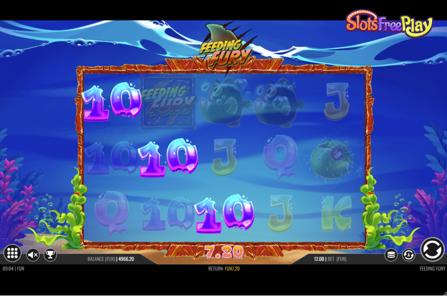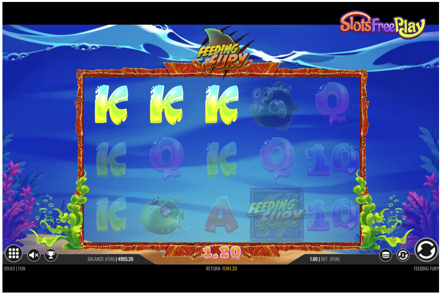 Dive into the immersive world of Feeding Fury, where the sound and gameplay seamlessly blend to create an aquatic adventure that resonates with the theme of fishing and the water world. As the reels spin, the melodic sounds of gentle waves, bubbling currents, and distant seagulls transport players to the tranquil yet exciting realm beneath the surface. The gameplay is skillfully designed to mirror the fluidity of water, with smooth reel animations and vibrant graphics depicting a captivating underwater landscape. The thematic symbols, from the Wild Shark to the playful Squid, Dolphin, Piranha, Puffer Fish, and Goldfish, come to life with crisp visuals, enhancing the overall visual and auditory experience.