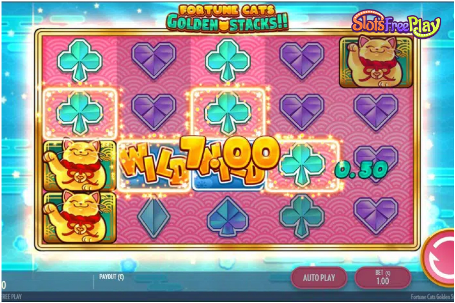 In "Fortune Cats Golden Stacks," the Wild symbol serves as a versatile and powerful icon that can substitute for other symbols (except for certain special symbols like Scatters or Bonuses) to create winning combinations. When the Wild symbol lands on the reels in conjunction with matching regular symbols, it contributes to the formation of winning lines, enhancing the overall potential for significant payouts. The Wild symbol, often depicted as the game's logo or a distinctive image, acts as a dynamic substitute, bridging the gaps between other symbols to complete winning combinations. This feature is particularly valuable during regular spins and bonus rounds alike.