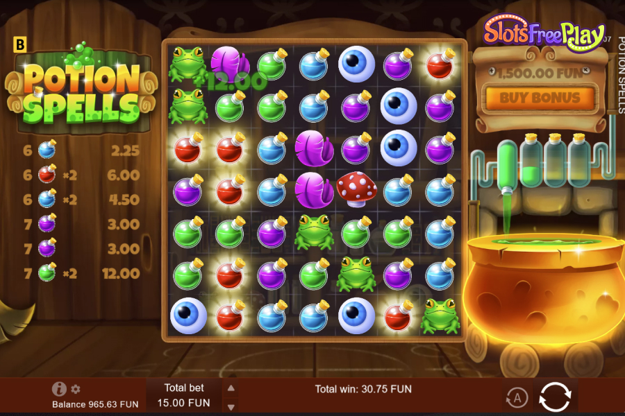 In the mesmerizing realm of Potion Spells, the maximum win scenario unfolds when players achieve the rare and magical feat of landing 15 or more clusters of the highest-paying symbols. In this enchanted scenario, the illustrious Frog takes center stage, generously rewarding players with an extraordinary multiplier of x15,000 the initial bet. Additionally, the mystical Mushroom adds to the enchantment, providing a substantial x6,000 multiplier for 15 or more clusters. Therefore, the maximum win scenario emerges when these high-paying symbols align perfectly on the reels, creating a symphony of magical clusters and unlocking the full potential of Potion Spells with unparalleled rewards.